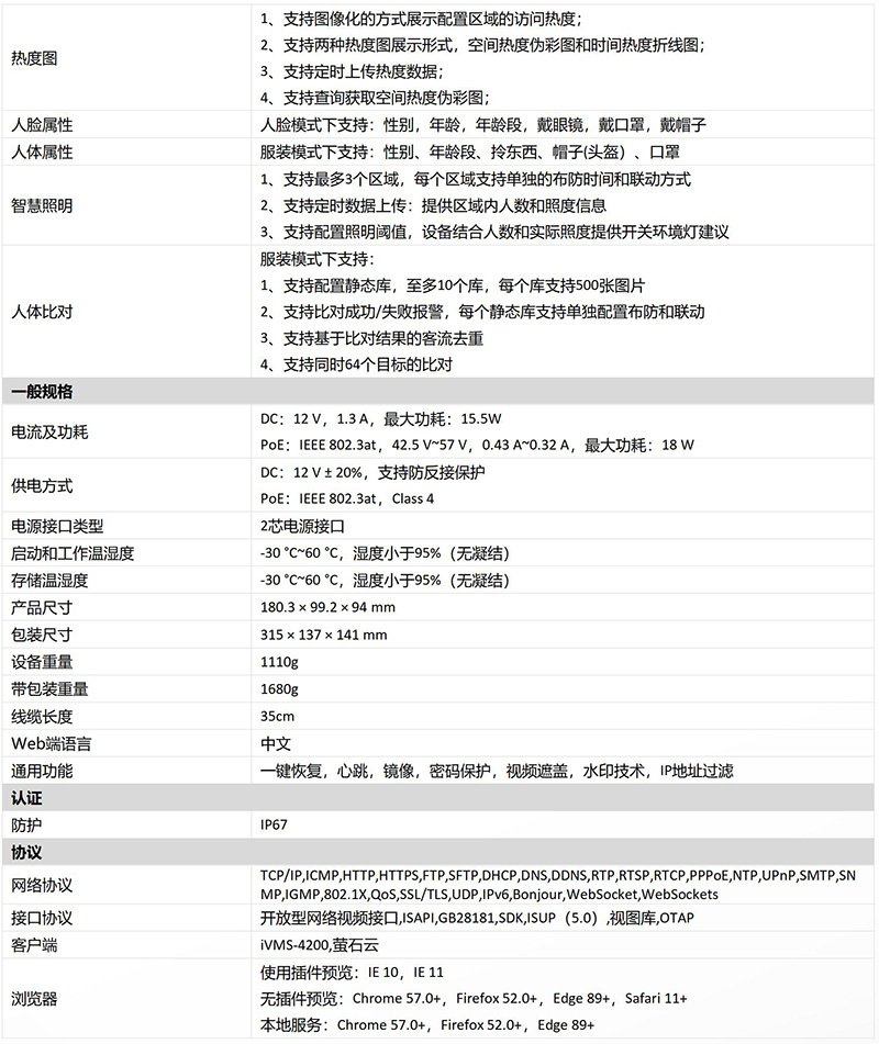 - 人脸模式:1、支持人脸的抓拍,人脸属性分类,支持基于人脸比对的客流计数过滤和设定时间内动态客流计数过滤;2、支持人脸属性分类,包含:性别,年龄段,眼镜,口罩,帽子、表情