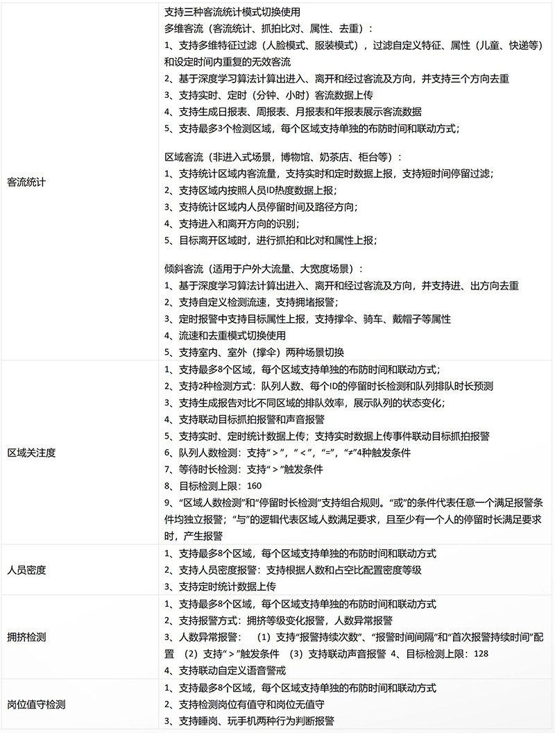- 多功能切换:支持多功能自动定时切换;支持多维客流、区域客流、倾斜客流、人数统计(岗位值守检测、区域关注度、热度图、环境照明检测)、拥挤检测、人员密度、smart事件等功能切换,并且支持对应报警功能自定义联动声光